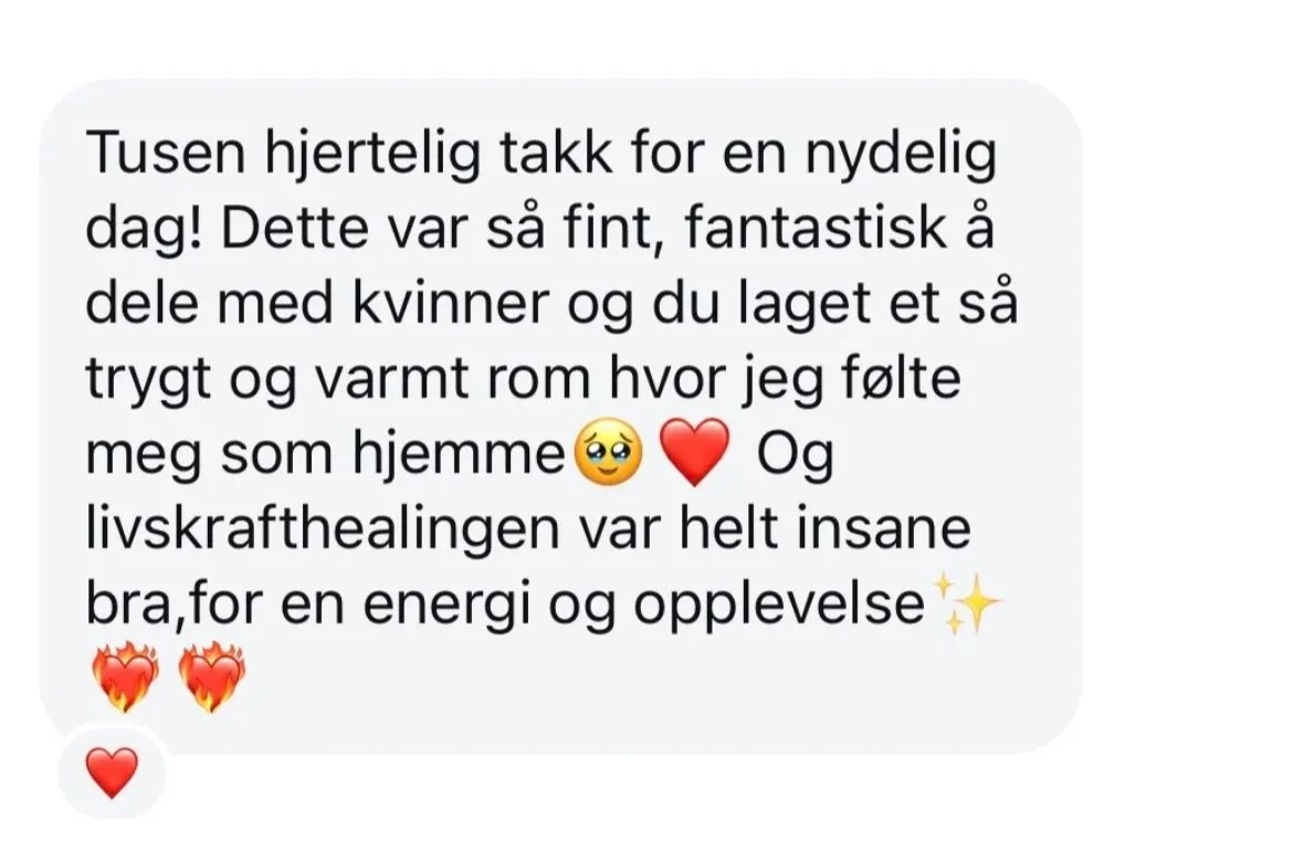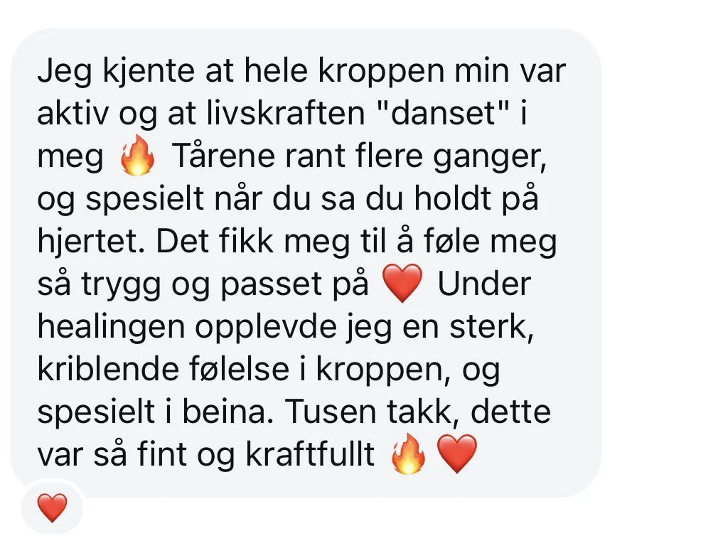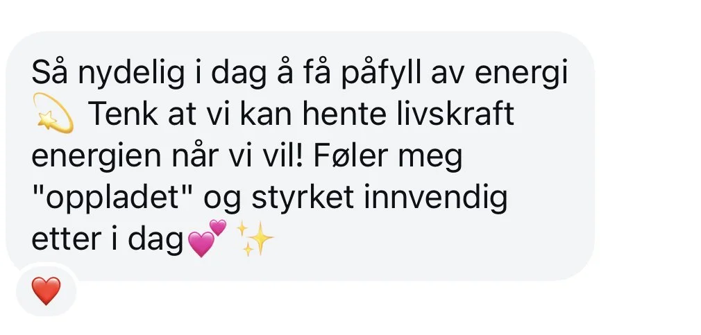 “Jeg har nesten ikke ord for hvordan det er å jobbe med deg! Det føles så trygt, naturlig og transformerende! Takk for at du skaper disse trygge rommene. Det er så mektig forløsende å kunne slippe ut det som har vært stengt inne i lang lang tid. Takk takk takk for deg! For alt du er og alt du gjør. Å få oppleve energiarbeid og mentoring med deg er så nydelig.”