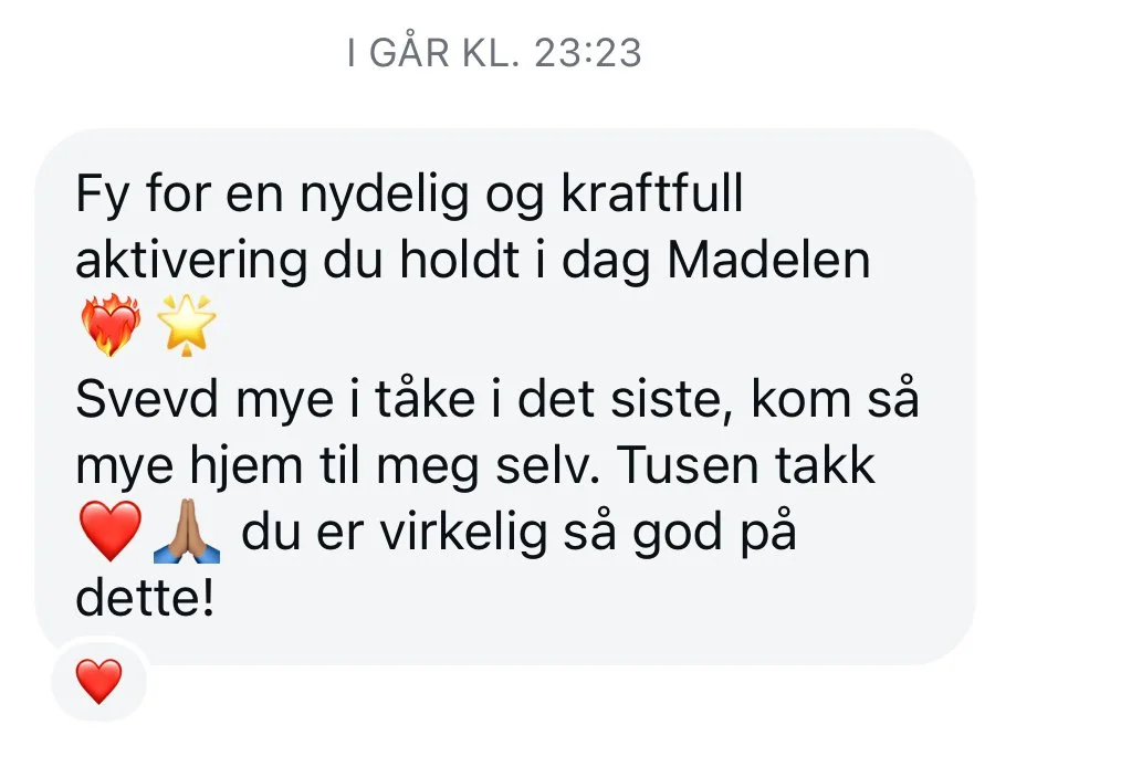 “Jeg har nesten ikke ord for hvordan det er å jobbe med Madelen. Det føles så trygt, naturlig og transformerende! Takk for at du skaper disse trygge rommene. Det er så mektig forløsende å kunne slippe ut det som har vært stengt inne i lang lang tid. Takk takk takk for deg! For alt du er og alt du gjør.”